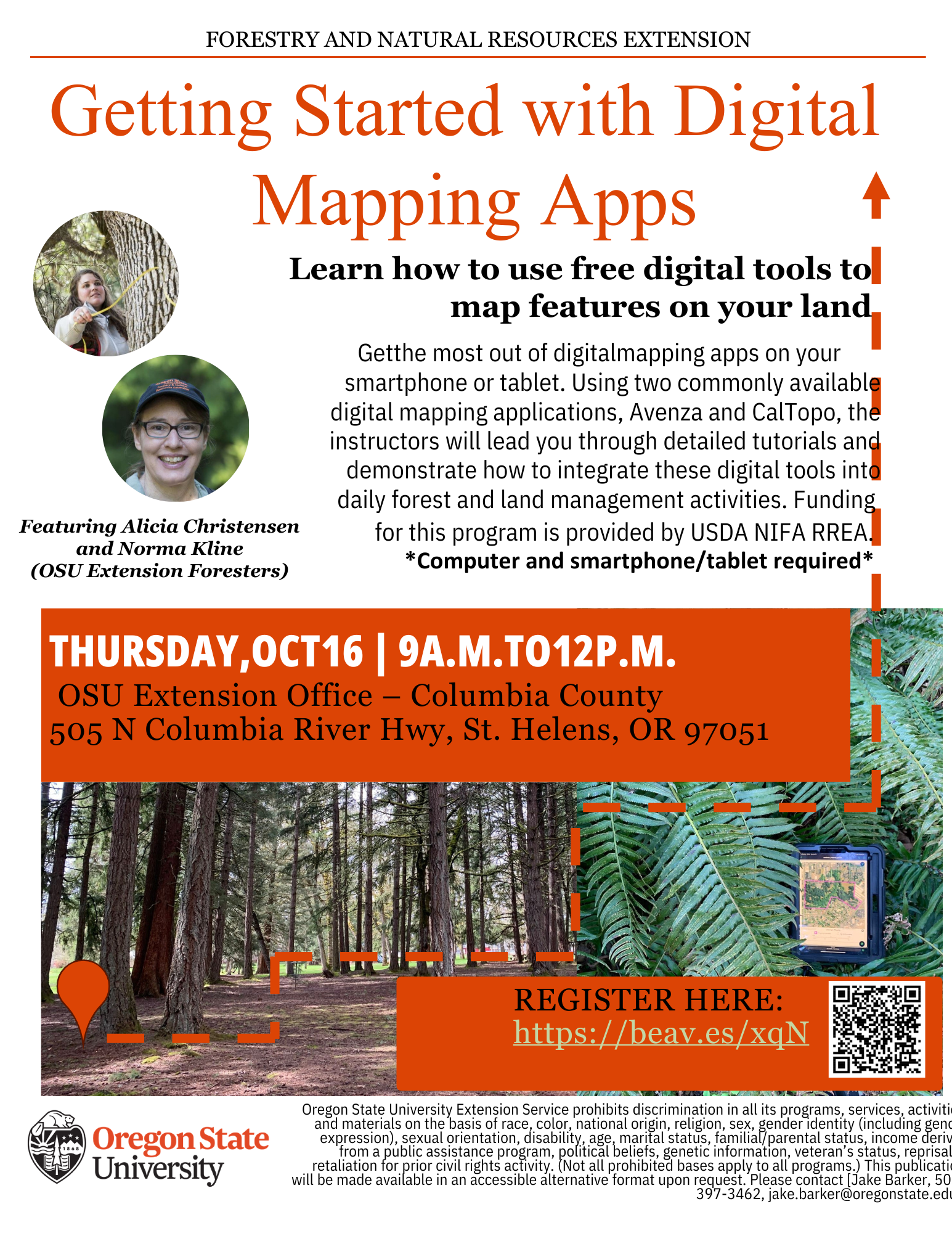 Get the most out of digital mapping apps on your smartphone or tablet. Using two commonly available digital mapping applications, Avenza and CalTopo, the instructors will lead you through detailed tutorials and demonstrate how to integrate these digital tools into daily forest and land management activities. Features Alicia Christensen and Norma Kline (OSU Extension Foresters) as instructors. Funding for this program is provided by USDA NIFA RREA. Computer and smartphone/tablet required.
