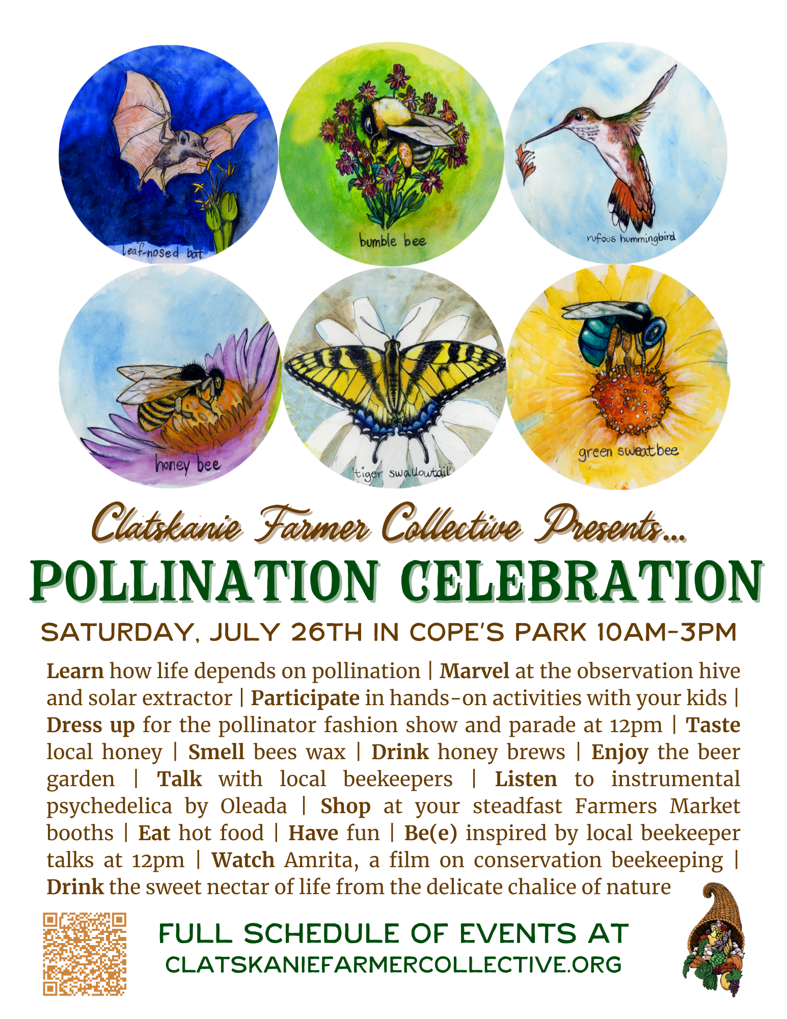 Saturday, July 26, 2025 · 10 AM–3 PM Cope’s Park & Clatskanie Food Hub Join us for a joyful day honoring the pollinators that make our gardens—and food systems—flourish! Hosted by the Clatskanie Farmer Collective, this is a free, family-friendly celebration.